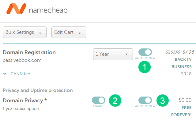 Step 4: Enable Domain Privacy that comes for free along with auto-renew. You don’t need any other paid addon.